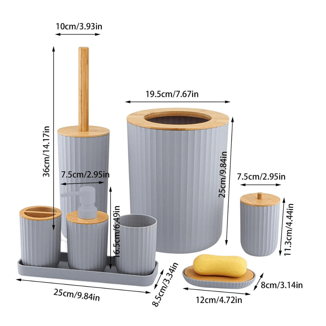 Elevate your bathroom decor with this 8-Piece Grey Bathroom Accessories Set. Featuring a bamboo-inspired design, the set includes a toilet brush, soap dish, lotion dispenser, toothbrush holder, trash bin, rinse cup, cotton pad dispenser, and a tray. Made from durable, waterproof plastic, this set is both elegant and practical, perfect for keeping your bathroom organized and stylish.